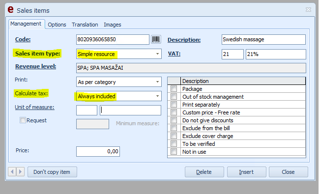 Also we have to remember, that massages and treatments are with PVM 21%, also we have to set Revenue level (we can create new if we want - how to do it : Revenue level. It is not necessary to show price here because we will set it in other place.