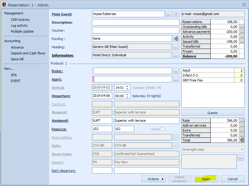 1) Open reservation card (you can do it from Front desk-> In house guests, or from planning)